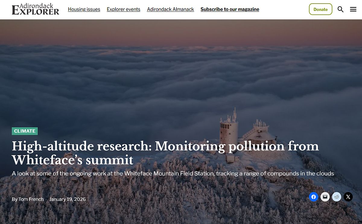 ADK Explorer article on Research at WFMJan 19, 2026This article in the Adirondack Explorer highlights much of the work our group has been doing at Whiteface Mountain, including long-term monitoring of cloud water chemistry with organic acids added in 2018, measurement of so-called "forever chemicals" (perfluoroalkyl substances, PFAS) in cloud water and precipitation samples, long-term air quality monitoring including measurements of gas phase (e.g. carbon monoxide, nitrogen oxides, sulfur dioxide, methane) and particulate (e.g. black carbon, ultrafine particles) pollutants, nanoplastic aerosol measurements (indoors), and microbiological analyses of cloud water samples. |