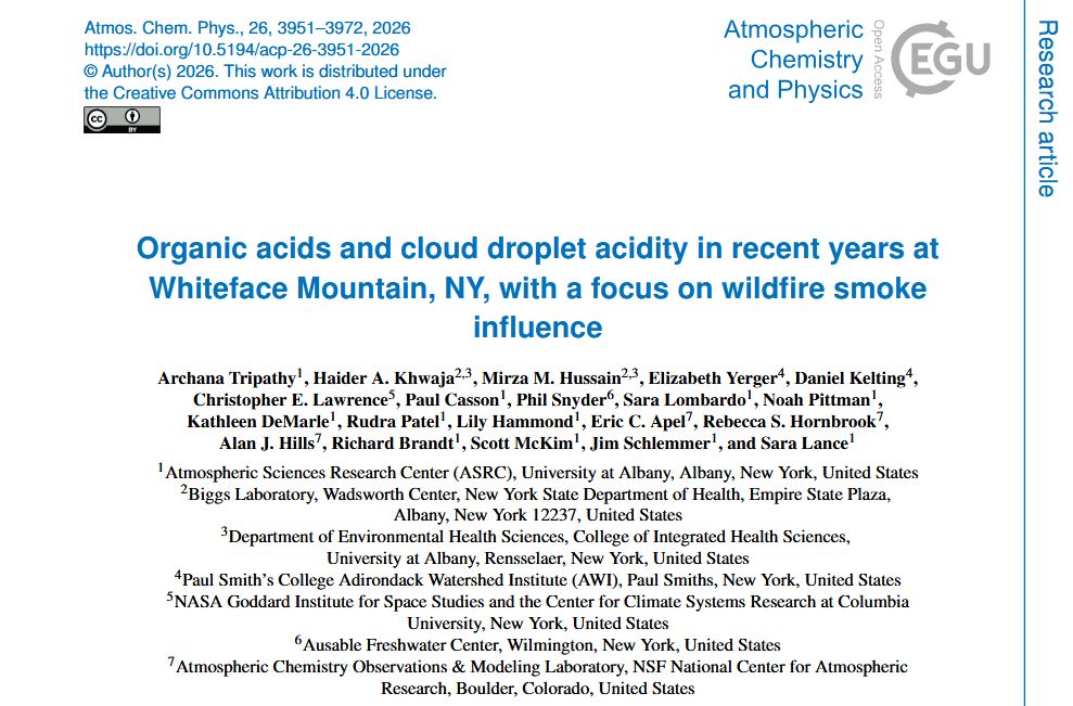 Archana's Paper published at ACP!Mar 20, 2026Archana's first paper is now published, a culmination of seven years of observations at Whiteface Mountain (WFM), focusing on organic acid measurements in cloud water samples collected at the WFM summit (like formatic acid, acetatic acid and oxalic acid). Yes, acetic acid is found in cloud water, and yes it is the same stuff vinegar is comprised of. The paper shows that wildfire smoke is an important source of organic acids and acidity in cloud droplets over this time period (2018-2024). |
