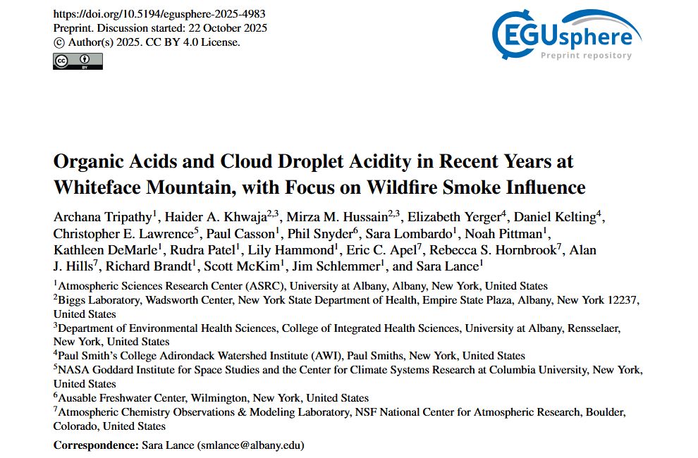 Archana's Paper in review at ACP!Oct 22, 2025Our paper describing seven years of cloud water chemical measurements from Whiteface Mountain (2018-2024) with a focus on low molecular weight organic acids: formate, acetate and oxalate, is under review for publication in the journal Atmospheric Chemistry and Physics (ACP). The paper highlights contributions of these organic acids to cloud droplet acidity and dissolved organic carbon, and contrasts fresh and aged wildfire smoke plumes from extreme smoke episodes impacting the northeast U.S. in the summers of 2021 and 2023. |